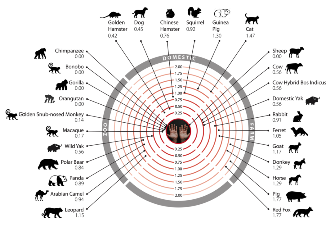 与人类接触的哺乳动物有被SARS-CoV2感染的危险。26种哺乳动物分为家畜,农业或生态环境。数字代表S蛋白:ACE2的结合能(ΔΔG)的变化,SARS-CoV-2 spike protein predicted to form stable complexes with host receptor protein orthologues from mammals, but not fish, birds or reptiles,bioRxiv preprint doi: https://doi.org/10.1101/2020.05.01.072371.