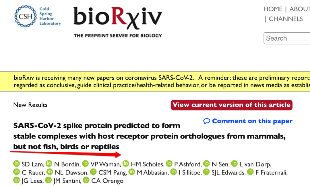 此前,来自马来西亚科技大学、伦敦大学学院、伦敦国王学院等机构研究者在生物预印本平台bioRxiv发表了名为题为:“SARS-CoV-2 spike protein predicted to form stable complexes with host receptor protein orthologues from mammals, but not fish, birds or reptiles”(预测SARS-CoV-2病毒可以与哺乳动物宿主的受体蛋白同源物形成稳定复合体,但同鱼类、鸟类或爬行类动物无法形成)的研究文章。