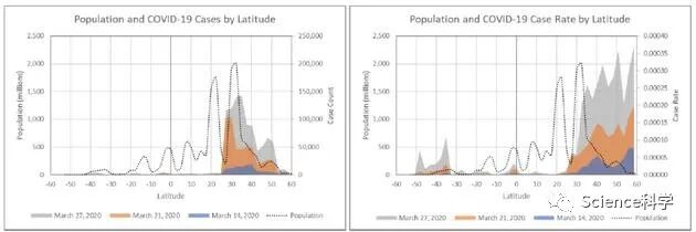 按3月14日至3月27日按照纬度分布的确诊病例(左)和确诊率(右)变化,纬度高于和低于30度的病毒确诊情况变化清晰可见
