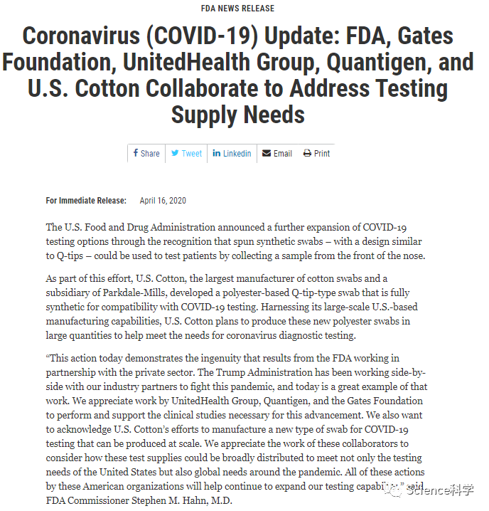 该研究由UnitedHealth集团、Quantigen和盖茨基金会牵头,与FDA合作进行。FDA局长、医学博士Stephen M. Hahn在一份声明中说:"我们很感谢这些合作者的工作,考虑到这些检测用品如何能够广泛分布,在大流行期间这将不仅满足美国的检测需求,而且还有全球需求。"
