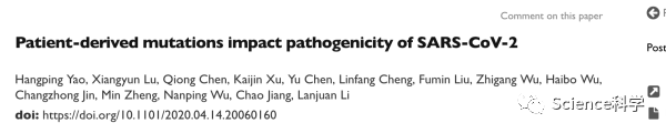 当地时间4月19日,浙江大学医学院附属第一医院传染病诊治国家重点实验室、浙江大学生命科学研究院、浙江省胰腺病研究重点实验室的研究团队在医学预印本平台medRxiv在线发表了一篇研究论文“Patient-derived mutations impact pathogenicity of SARS-CoV-2”。该论文通讯作者为中国工程院院士、国家卫健委高级别专家组成员李兰娟教授,浙江大学生命科学研究院研究员蒋超,浙江大学医学院附属第一医院传染病诊治国家重点实验室吴南屏教授和郑敏教授。