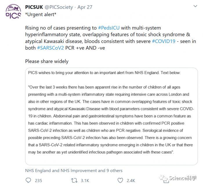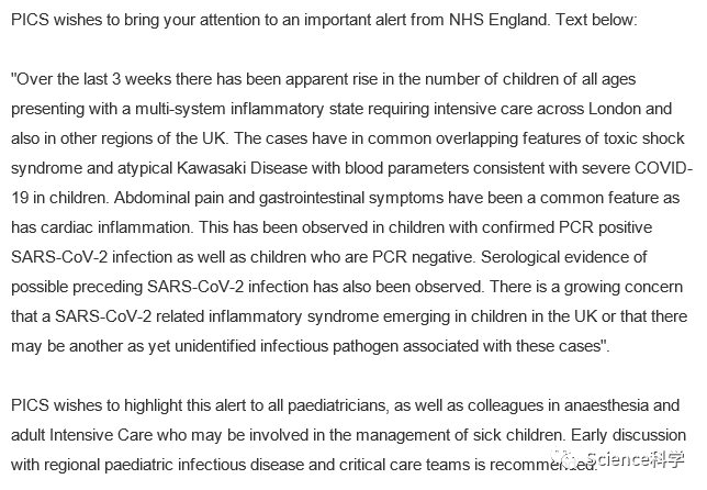 英国儿科重症监护协会(Paediatric Intensive Care Society)通过Twitter发布了这一警告信息。该协会在这条讯息中指出,所有年龄的儿童都可能会表现出需要接受重症监护的多系统炎症状态。