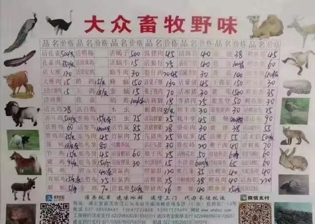 根据目前的信息,发生在武汉的新型冠状病毒来源地,武汉华南海鲜市场中不仅仅有一般的家禽家畜出售,还有各种山珍野味。下图为一家名为“大众畜牧野味”店的菜单,显示有活狗狸獾、活猪狸獾、活竹鼠、竹鼠肉、活果子狸、果子狸肉等野生动物食品出售。并号称:“活杀现宰、速冻冰鲜、送货上门、代办长途托运”。在该市场所在的西区六街角落,可见随便丢弃的野物宰杀残余、内脏等。不仅不符合一般市场卫生要求,更增加了病毒传播途径。
