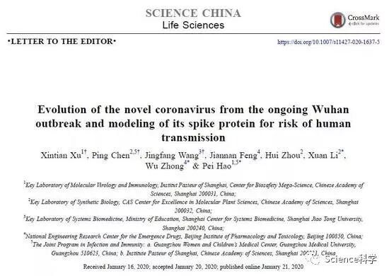 通过对几组样本数据的分析,2020年1月21日,中国科学院上海巴斯德研究所郝沛研究员、军事医学研究院国家应急防控药物工程技术研究中心钟武研究员和中科院分子植物卓越中心合成生物学重点实验室李轩研究员合作,在SCIENCE CHINA Life Sciences上在线发表了题为“Evolution of the novel coronavirus from the ongoing Wuhan outbreak and modeling of its spike protein for risk of human transmission”的论文,为我们认识这种新型病毒又提供了重要线索。(戳文末“阅读原文”查看论文)