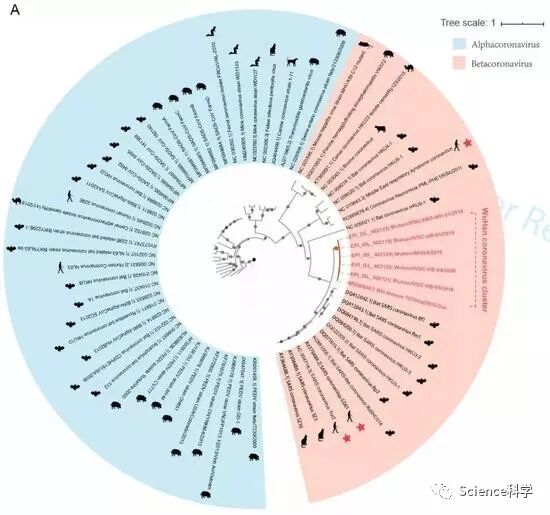 冠状病毒可分为四个属:α、β、γ、δ,SARS和MERS冠状病毒均是β属冠状病毒。进一步遗传进化分析后,研究者发现新型冠状病毒也是β属冠状病毒(Betacoronavirus)。它在进化树的位置上与SARS病毒和类SARS(SARS-like)病毒的类群很接近,但是并不属于SARS和类SARS病毒类群。