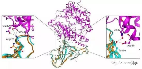 论文作者利用分子结构模拟的计算方法,对武汉冠状病毒S-蛋白和人ACE2蛋白进行了结构对接研究,结果令人惊讶:虽然武汉冠状病毒S-蛋白中5个关键氨基酸有4个发生了变化,但变化后的氨基酸,却整体性上非常完美的维持了SARS病毒S-蛋白与ACE2蛋白相互作用的原来的结构构象,与人ACE2蛋白的亲和力还是很强。