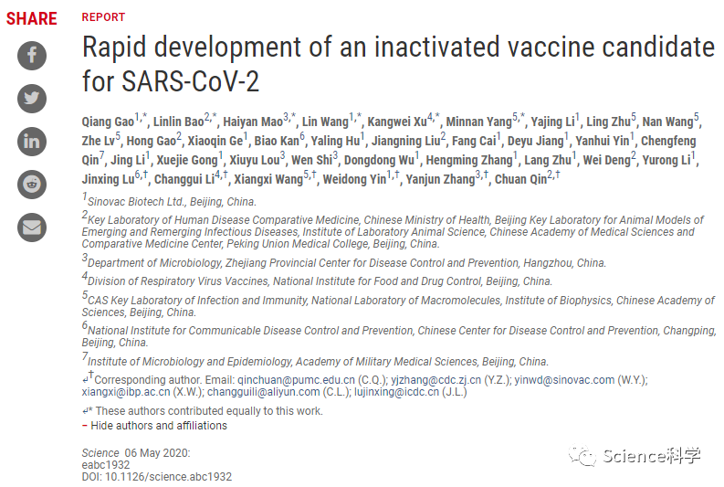 6日,Science杂志官方网站发布了由中国医学科学院医学实验动物研究所秦川团队领衔,联合浙江省疾控中心张严峻团队、科兴控股生物技术有限公司、中国科学院生物物理研究所王祥喜团队、中国食品药品检定研究院、中国疾病预防控制中心传染病预防控制所等多家单位合作完成的研究文章Rapid development of aninactivated vaccine for SARS-CoV-2(《SARS-CoV-2病毒灭活疫苗的快速开发》)。这是首个公开报道的新冠疫苗动物实验研究结果。此前的4月19日,该论文的预览版在生物科学预印本论文平台bioRxiv发布。