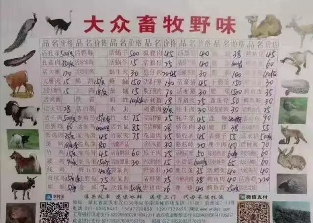 网络流传的一张武汉野味餐厅菜单(野味种类繁多)