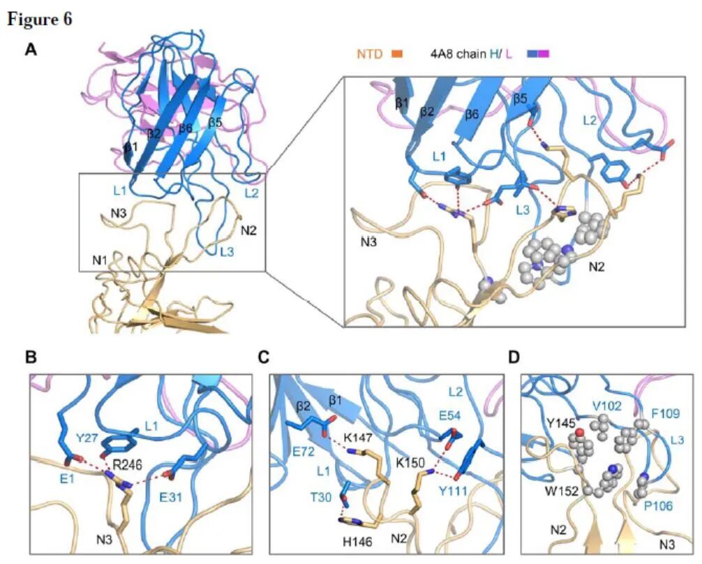 这些结果表明,除了抑制病毒与受体的相互作用外,还存在其他重要的SARS-CoV-2中和机制,例如4A8抗体病毒S蛋白氮端结构域(NTD)相结合的中和方式。