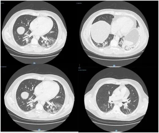初步检查无异常,所做CT扫描显示双侧下叶磨玻璃样阴影(图3),入院时他有淋巴细胞减少症,C反应蛋白和纤维蛋白原升高,但原降钙素处于正常范围。在急诊病房采集的痰液样本中没有发现病原体。这名患者入住ICU,接受抗生素治疗,因病情发生好转于2019年12月29日出院。