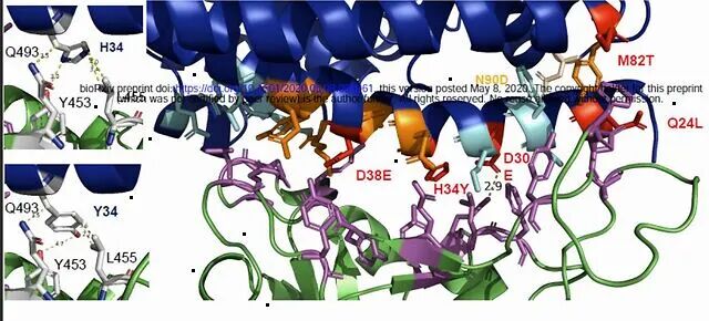 总之,部分动物ACE2与与人类ACE2相比,和新冠病毒S蛋白相互作用表面中大量的氨基酸变化都不影响其结合,其中猪ACE2中有5个氨基酸取代,而灵猫ACE2中则有7个氨基酸变化。