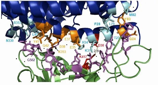 研究表明,新冠病毒入侵时,其S蛋白中的17个残基与ACE2中的20个氨基酸接触,其中8个氨基酸与S蛋白中的13个残基形成氢键。