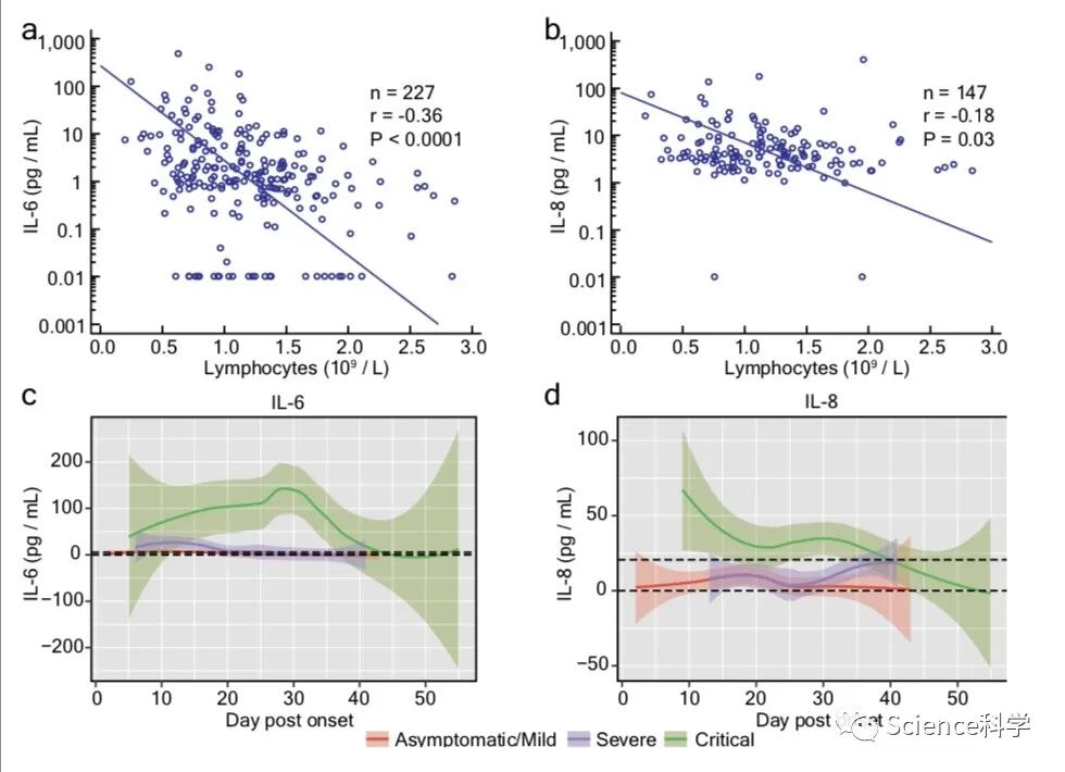 此外,研究对主要细胞因子的纵向监测表明,IL-6和IL-8与淋巴细胞计数呈负相关,IL-6动力学与疾病严重程度高度相关。