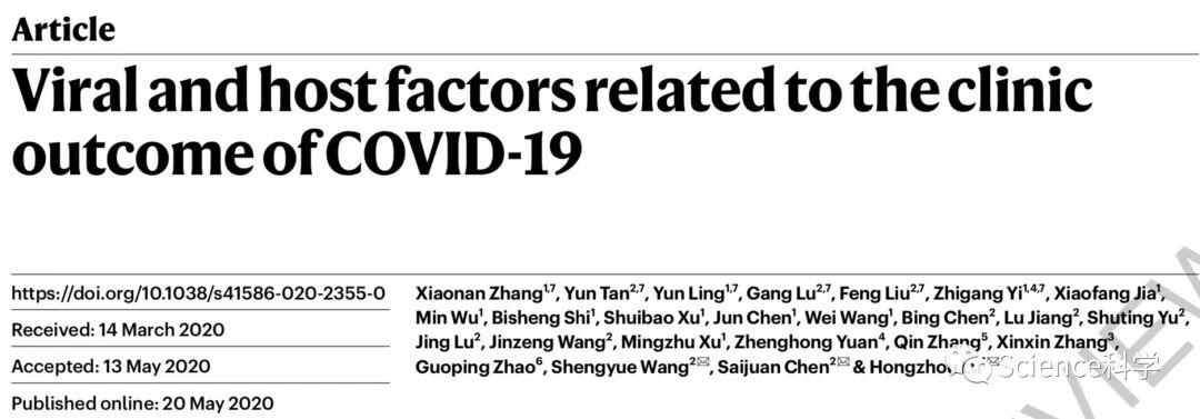 上述研究来自当地时间5月20日顶级学术期刊《自然》(Nature)以“加快评审文章 (Accelerated Article Preview) ”形式在线发表的一项研究,题为“Viral and host factors related to the clinic outcome of COVID-19”。该研究由来自复旦大学附属上海市公共卫生临床中心、上海交通大学附属瑞金医院、上海血液学研究所、医学基因组学国家重点实验室、中科院植物生理生态研究所、上海巴斯德研究所和上海营养与健康研究所等多家上海科研和医疗单位合作完成。研究团队分析了1月下旬至2月期间,在上海公共卫生临床中心收治的326例新冠患者的SARS-CoV-2病毒样本。
