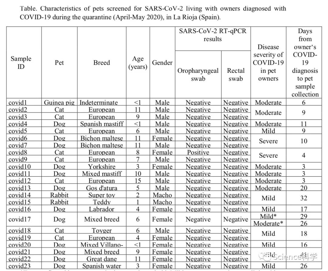 2020年4月8日至5月4日期间,里奥哈一家医院(Hospital Universitario San Pedro)内17个确诊COVID-19家庭的23只宠物被纳入该研究,包括8只猫、1只豚鼠、2只兔子和12只狗,它们均没有表现出和新冠感染相关的临床症状。这些家庭都位于里奥哈,研究团队采集了每只宠物的两个样本,包括口咽和直肠拭子。