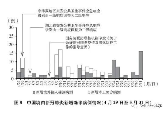 境内疫情总体呈零星散发状态,局部地区出现散发病例引起的聚集性疫情,境外输入病例基本得到控制,疫情积极向好态势持续巩固,全国疫情防控进入常态化。加大力度推进复工复产复学,常态化防控措施经受“五一”假期考验。经中共中央批准,国务院联防联控机制派出联络组,继续加强湖北省疫情防控。(图8)