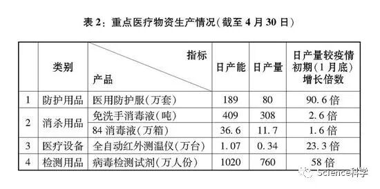 大力加强医疗物资生产供应和医疗支持服务。疫情防控阻击战,也是后勤保障战。疫情初期,武汉市医疗防护物资极度短缺,为了节省防护用品、争分夺秒抢救病患,一线医护人员克服困难,最大限度地延长防护用品使用时间。为尽快解决医疗资源短缺和病患急剧增多的突出矛盾,中国充分发挥制造业门类全、韧性强和产业链完整配套的优势,克服春节假期停工减产等不利因素,开足马力,深挖潜力,全力保障上下游原料供应和物流运输,保证疫情防控物资的大规模生产与配送。医疗企业克服工人返岗不足等困难,以最快速度恢复医疗用品生产,最大限度扩大产能。其他行业企业迅速调整转产,生产口罩、防护服、消毒液、测温仪等防疫物资,有效扩大了疫情防控物资的生产供应。快速启动防控医疗物资应急审批程序,全面加强质量安全监管,确保以最快的速度批准上市、促产保供,截至5月31日,共应急批准17个药物和疫苗的19件临床试验申请,附条件批准2个疫情防控用药上市。在各方共同努力下,医用物资产能不断提升,医用物资保供实现从“紧缺”到“紧平衡”“动态平衡”“动态足额供应”的跨越式提升(表2)。2月初,医用非N95口罩、医用N95口罩日产量分别为586万只、13万只,到4月底分别超过2亿只、500万只。畅通供应链条和物流渠道,建立联保联供协作机制,源源不断地把全国支援物资运送到疫情防控重点地区。