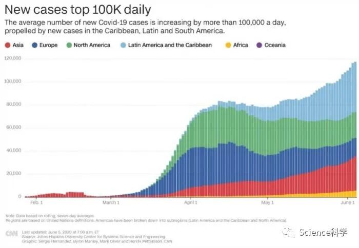 CNN利用约翰斯·霍普金斯大学的相同数据,制作了以下图表,显示了自1月下旬以来各大洲的疾病进展情况。图中显示了COVID-19“震中”如何从中国转移到欧洲,然后再转移到美国。目前,巴西、拉丁美洲和加勒比地区的病例激增。过去几周,亚洲的病例数也在逐渐增加,而非洲COVID-19疫情似乎远未达到高峰。