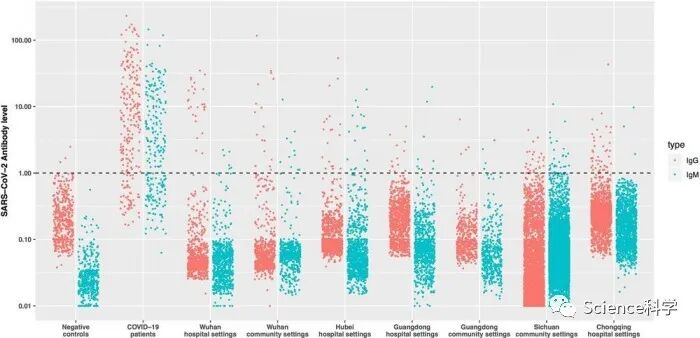 该项研究调查了湖北、四川、重庆、广东等地区共17368例各类人群的血清新冠病毒特异的IgG和IgM抗体阳性率。调查时间为2020年3月9日至4月10日。