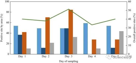 每天对 44 处进行采样,总体 / 不同区域的阳性检出占比。