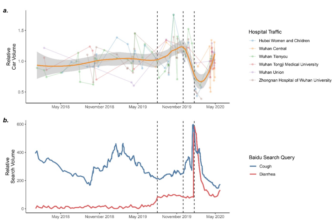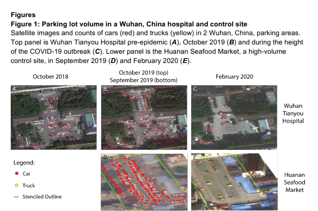 这篇论文的主要内容,是通过对比2018年10月和2019年10月这两个时间段,武汉中南医院、湖北妇幼保健院、武汉天佑医院、武汉同济医院、武汉中心医院和武汉协和医院这6所医院停车场内车辆数量的变化,以及对比这两个时间段里武汉网民在中国百度搜索引擎检索“咳嗽”和“腹泻”这两个关键词的数量,便得出了一个在新冠肺炎被中国官方于12月底发现之前的2019年秋季甚至8月,当地就可能已经出现了异常的结论。