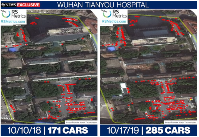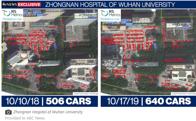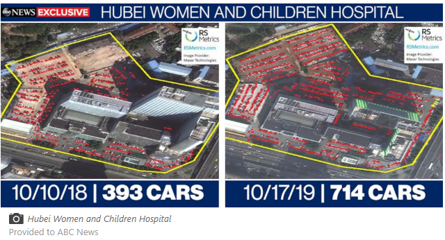 而在这篇论文甚至还没有预发布之前,就已经拿到了论文的更多数据并进行了“独家”报道的美国广播公司(ABC),则给出了更多哈佛医学院这篇论文没有公开在哈佛Dash平台上的数据,比如下面这四张对比了武汉中南医院、同济医院、天佑医院和湖北妇幼保健院停车场车辆数在2018年10月和2019年10月变化的图片: