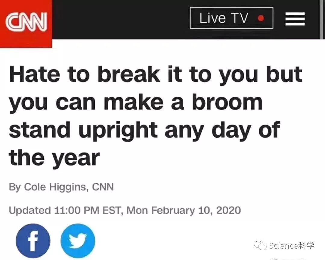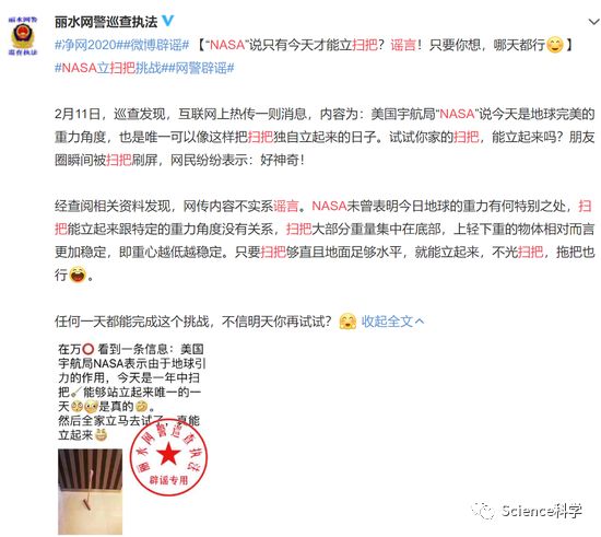 还是在2月11日,网上热传一条消息,内容为美国宇航局“NASA”说今天是地球完美的重力角度,也是唯一可以像这样把扫把立起来的日子。对此,丽水网警通过微博辟谣,称经查阅相关资料发现,网传内容不实系谣言。