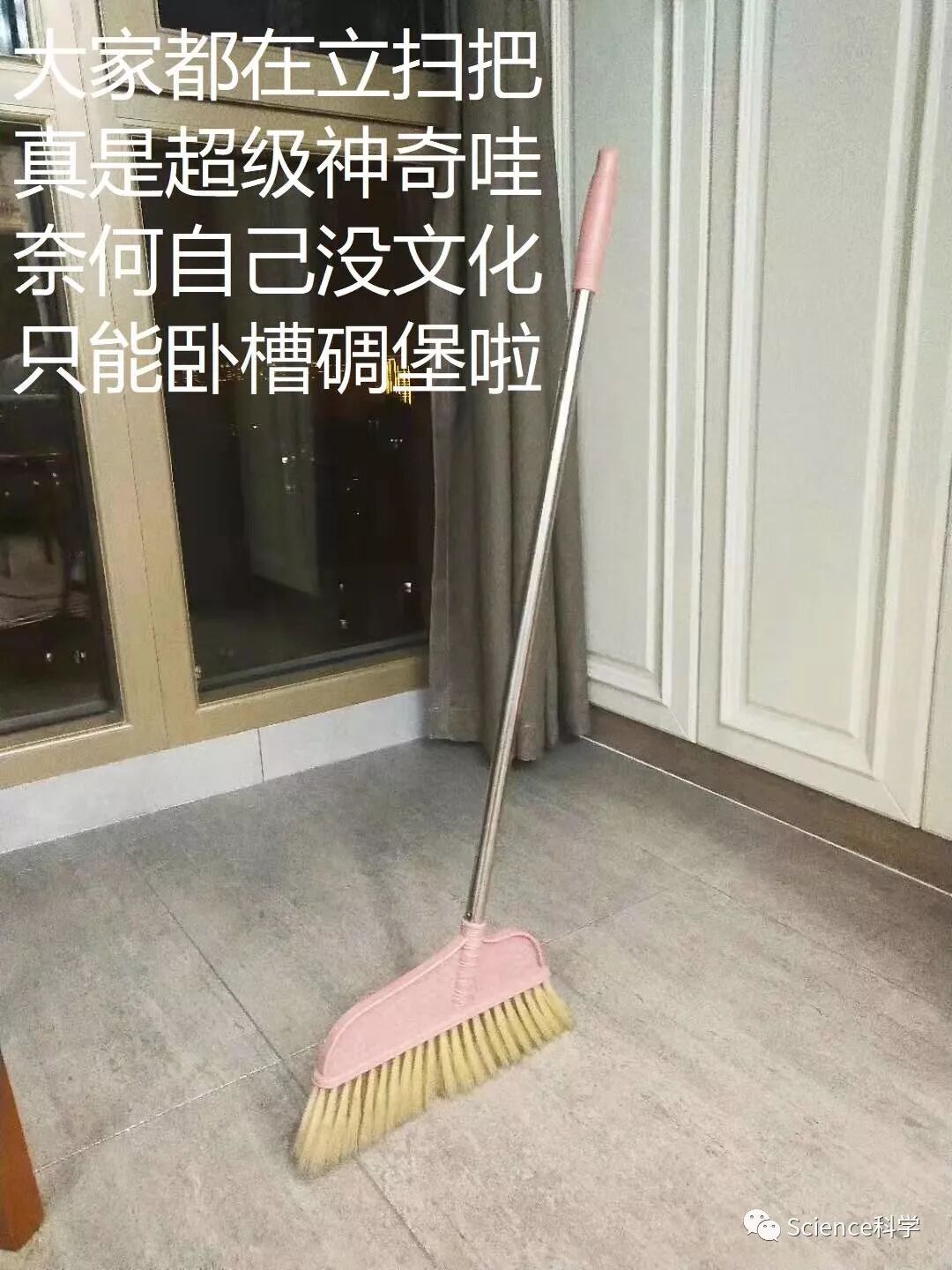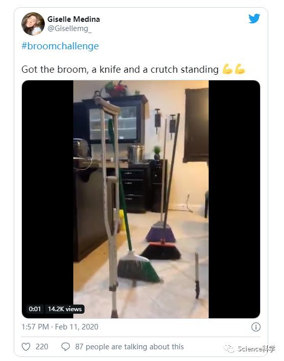 不过这几天“立扫把挑战”确实引发了网友在社交网络上的疯狂实验和吐槽。有体验派网友亲身示范,表示谁家里还没有扫把,“亲测有效,被魔法小扫把惊艳到!”。还有网友表示,“大家都憋疯了”、“回过神发现全世界都在立扫把”、“以为朋友圈在举行什么古老而神秘的仪式”。除了立扫把,还有人在网上发出了立剪刀、立黄瓜、立纸币等图片。