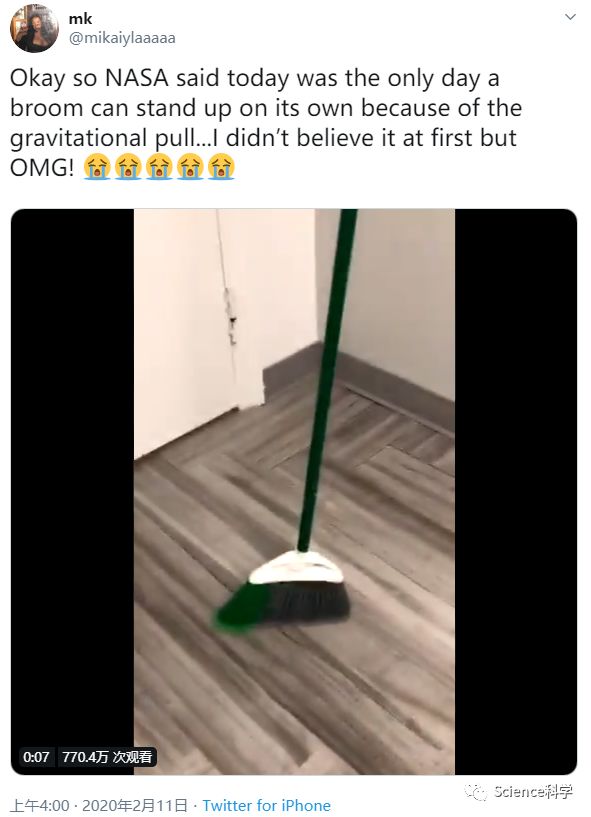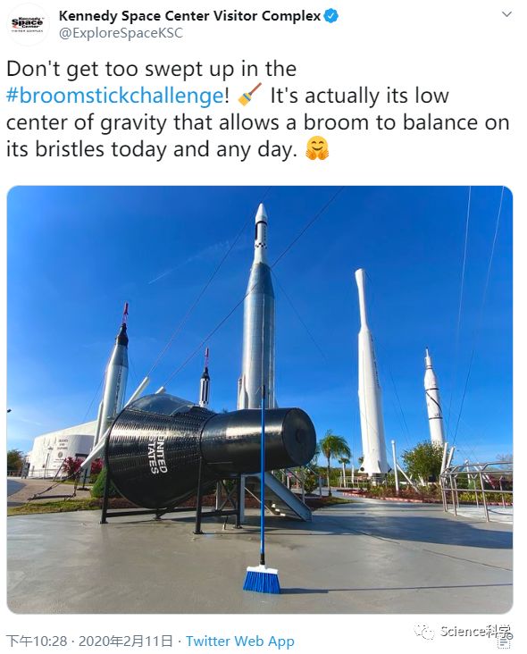 肯尼迪航天中心游客中心的推特账号警告说:“不要进行立扫把挑战。实际上,它的重心很低,可以使扫帚在今天和任何一天保持其刷毛的平衡。”