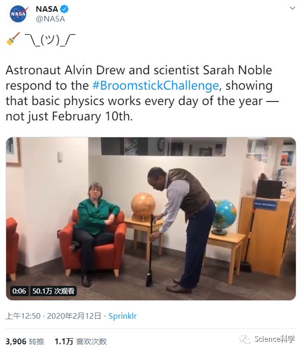 不过NASA随后澄清,该机构此前从未说过这样的话。在周二NASA官方推特帐户发布的9秒视频中,宇航员Alvin Drew和科学家Sarah Noble对“立扫把挑战”作出回应,表明这只是简单的地心引力,每天都可立起扫把。