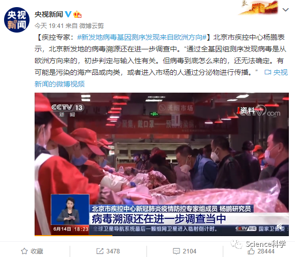据央视新闻报道,北京市疾控中心杨鹏表示,北京新发地的病毒溯源还在进一步调查中。