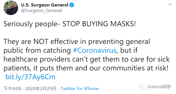 2月29日,美国卫生总署负责人杰罗姆·亚当斯(Jerome Adams)在其官方推特账号上发出了以下推文。“停止购买口罩! 它们并不能有效地防止普通民众感染新冠病毒,但如果医疗服务提供者不能用它们来照顾患者,就会让他们和我们的社区面临风险!”