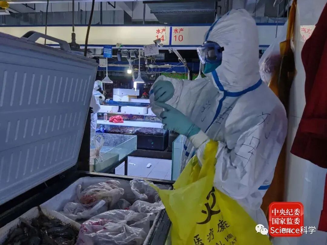 “我们不少人此前在武汉参加过溯源工作,还是有一定经验的。”作为在武汉的溯源组组长,病毒病所所长助理、国家流感中心副主任刘军研究员解释说:“病毒是怎么来的,目前有这样一些推测:被污染的海产品或肉食品通过冷链运输到市场造成传播,或者感染者进入市场造成了传播。针对这两种可能的来源,我们推测了病毒可能会污染的一些环境位置,以及物品食品等等。比如我们首先对鱼虾等冻品以及可能大量接触这些冻品的砧板、柜台、案板进行了检测,它们被病毒污染的可能性是非常高的。另外我们也想到,新冠病毒的感染者在市场里边排毒后,可能会污染哪些地方?比如他打一个喷嚏会不会打到墙面或冰箱的表面,会不会污染地面,是否会污染周围的鱼缸和水沟等等,这些都是我们要重点取样的。”