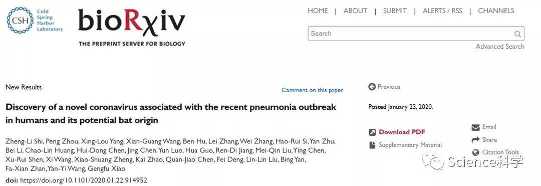 早在1月23日,中科院武汉病毒研究所石正丽团队就在bioRxiv预印平台上发表文章,报道了武汉疫情的nCoV-2019可能和2003年SARS一样来源蝙蝠。