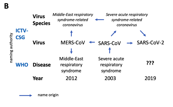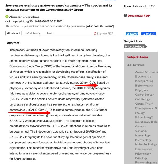 近年来三次外溢冠状病毒命名主体,doi:https://doi.org/10.1101/2020.02.07.937862