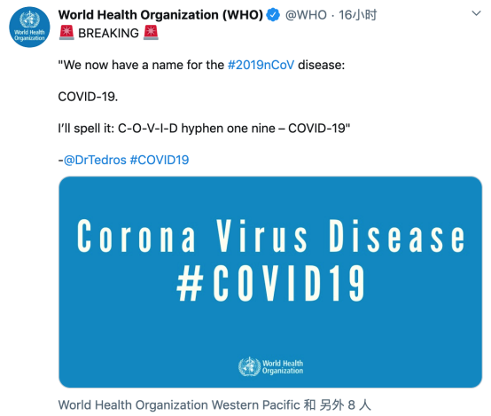 2月11日,世界卫生组织召开新一轮会议,探讨有关新冠病毒疫情事宜。将此次新型冠病毒肺导致的肺炎疾病命名为【COVID-19】,即 Coronavirus disease 2019 的缩写。