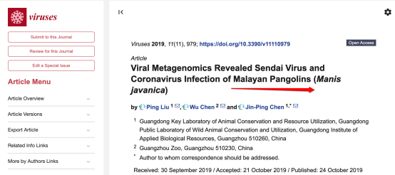 事实上早在去年,2019年10月24日,广东省动物保护中心陈金平团队在《Viruses》上发表文章“Viral Metagenomics RevealedSendai Virus and Coronavirus Infection of Malayan Pangolins (Manis javanica)”,这项研究提供了对马来亚穿山甲(Manis javanica)的病毒群落以及马来亚穿山甲与其他宿主之间主要病原性病毒的分子流行病学的认识。