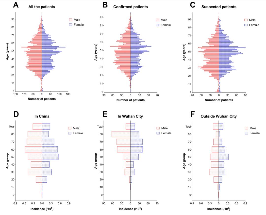 武汉市以外的患者,年龄要比武汉内的低,可能返乡以青年人为主