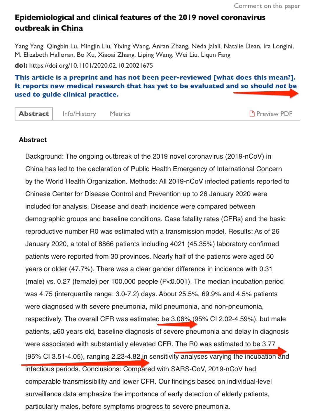 2月12日,自军事医学科学院微生物流行病研究所、中国疾控中心和北京大学、美国佛罗里达大学、美国福瑞德·哈金森癌症研究中心等多家中外机构联合在论文预印本网站“Medrxiv”发表关于新冠肺炎最新论文,他们通过比较人口统计学和基线状况之间的疾病和死亡发生率。用传播模型估计病死率(CFR)和基本生殖数R0。