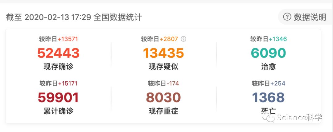 截至2月13日18时,据31个省(自治区、直辖市)和新疆生产建设兵团报告,现有确诊病例52443例,因诊断标准更改,新增13571例。(其中重症病例8030例),治愈6090例,死亡1368例,疑似13435例,累计收到港澳台地区通报确诊病例77例:香港特别行政区51例(死亡1例,治愈1例),澳门特别行政区10例(治愈出院2例),台湾地区18例(治愈出院1例)。