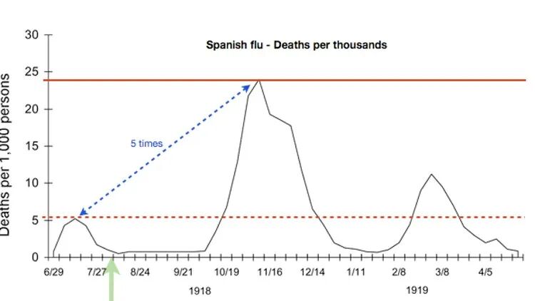 西班牙大流感爆发情况,千人死亡数,来源:美国CDC