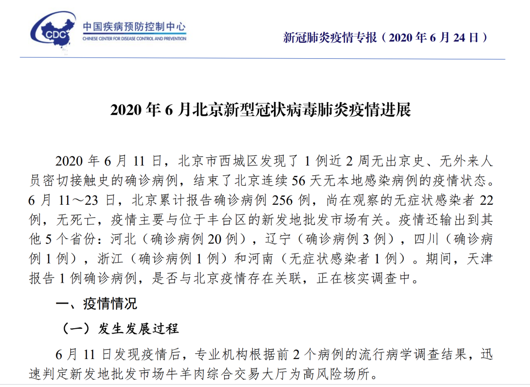 中国疾病预防控制中心6月24日公布了“2020年6月北京新型冠状病毒肺炎疫情进展”。报告指出,北京本次疫情排除武汉流行毒株或动物病毒外溢导致,并研判北京疫情近期有望得到控制。进一步病毒来源分析中指出,从2例确诊病例及北京新发地批发市场环境采集的标本中获得的3株病毒基因分析显示,北京本次疫情流行的新冠病毒为L基因型欧洲家系分支Ⅰ,该毒株比当前欧洲流行同型毒株更“老”;可以排除由动物病毒外溢传染人,也排除今年4月前北京本地传播毒株或武汉流行毒株导致本次疫情。