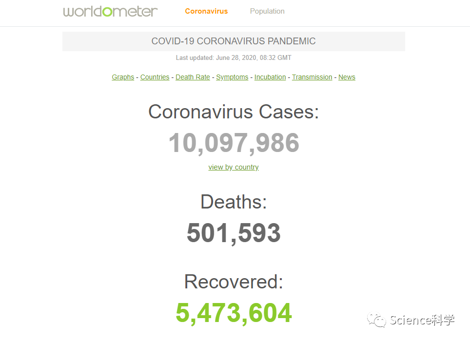 据专业数据统计网站Worldmeter,在北京时间6月28日2时12分左右,全球新冠肺炎确诊病例累计超过1000万,而至截稿时止,累计确诊病例已经接近1010万,同时累计死亡突破50万,累计治愈接近550万。