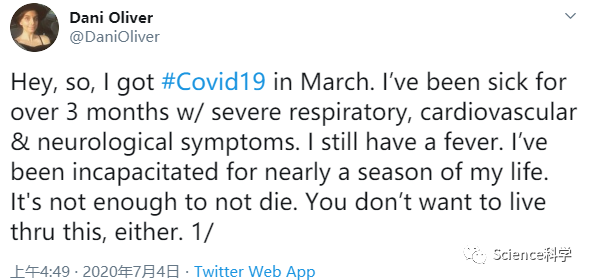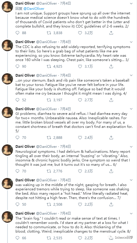 Oliver继续分享了她和她遇到的其他COVID-19患者所经历的一系列严重症状。以下是其中的一部分,引自她在Twitter上的帖子: