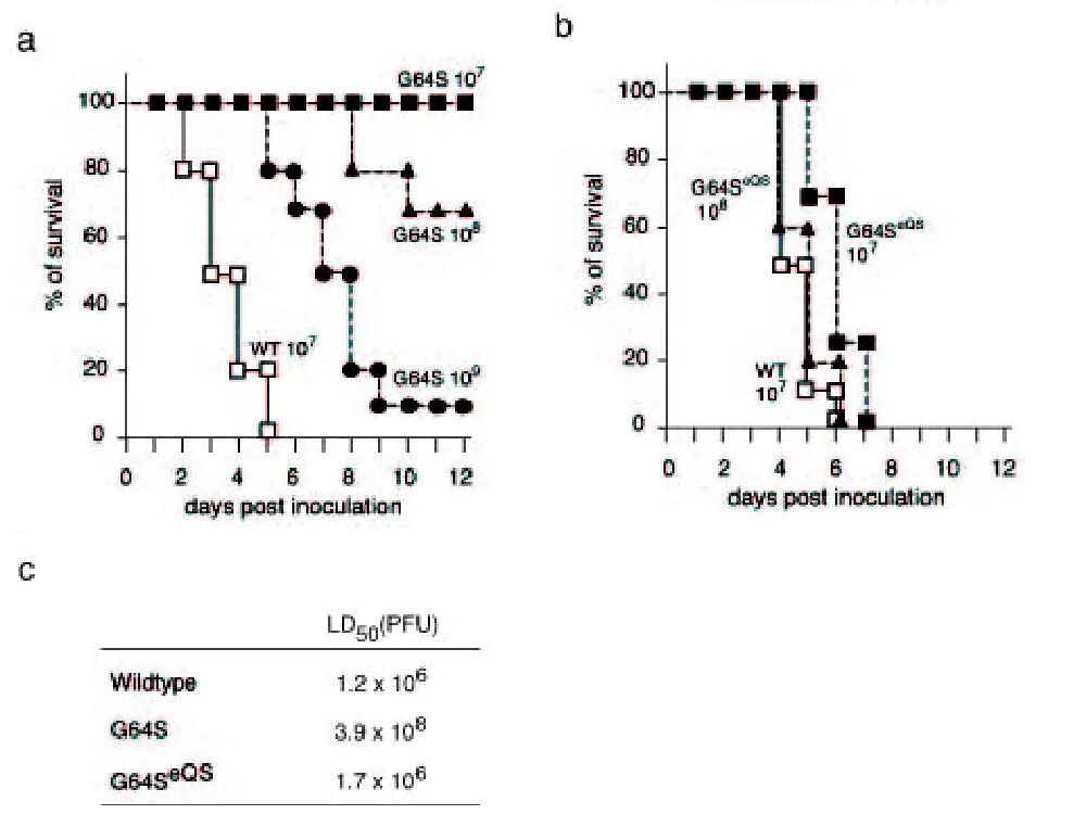 Vignuzzi等分析了脊髓灰质炎病毒野生型(WT)、准种(G64S)、人为扩大的准种(G64SeQS,即破坏了准种的限制)三个病毒种群对小鼠的杀伤力,准种的半数致死量及所感染的小鼠存活率均高于其他两个。