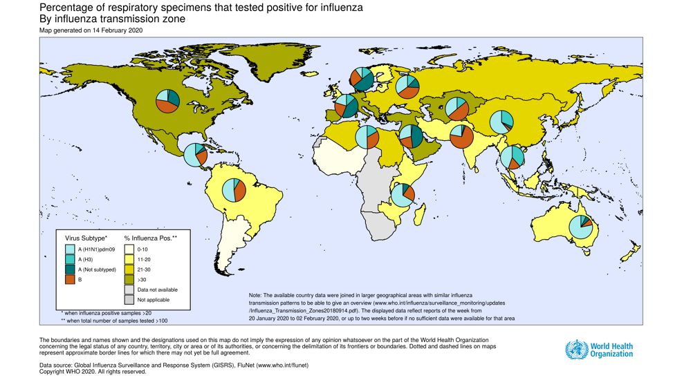 2月17日,世界卫生组织(WHO)官方网站更新了最新代号361的流感报告,这份报告中覆盖了4种类型流感病毒的全球蔓延状况:甲型流感(H1N1)、甲型流感(H3N2)、B-Yamagata谱系和B-Victoria谱系。