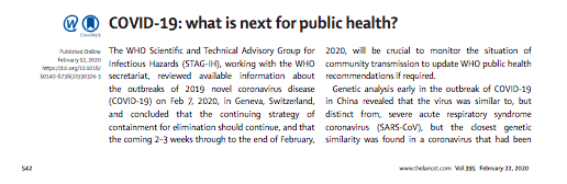 2月13日,英国伦敦卫生与热带医学学院传染病流行病学和世界卫生组织(WHO)的专家共同在《柳叶刀》(The Lancet)发文,探讨COVID-19疫情接下来会发生的一种可能性是:新发现的SARS-CoV-2具有流感类似的特征,大多数被感染者症状较轻且疾病呈自限性(即可以自己好),老年人或者有合并基础疾病的患者被感染后较重。