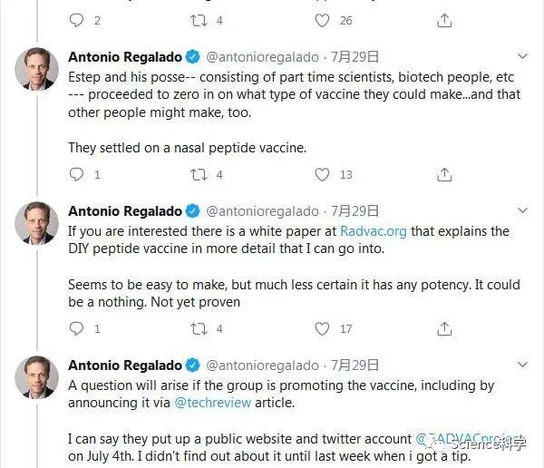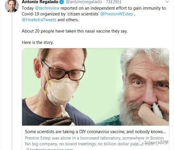 根据《麻省理工科技评论》编辑安东尼奥·雷加拉多(Antonio Regalado)发布的报道,至少有 20 名研究人员将现有的疫苗混合在一起,然后将其喷洒在自己的鼻子上。他们称这项操作是快速部署疫苗合作组织(Radvac)的一部分。
