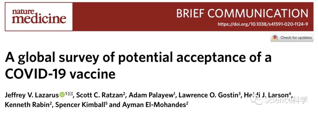 该研究题为“A global survey of potential acceptance of a COVID-19 vaccine”,通讯作者为西班牙巴塞罗那全球健康研究所的Jeffrey Lazarus教授,研究人员来自西班牙、美国、英国等团队。这是第一个专门评估新冠肺炎疫苗全球接受度的公开研究。