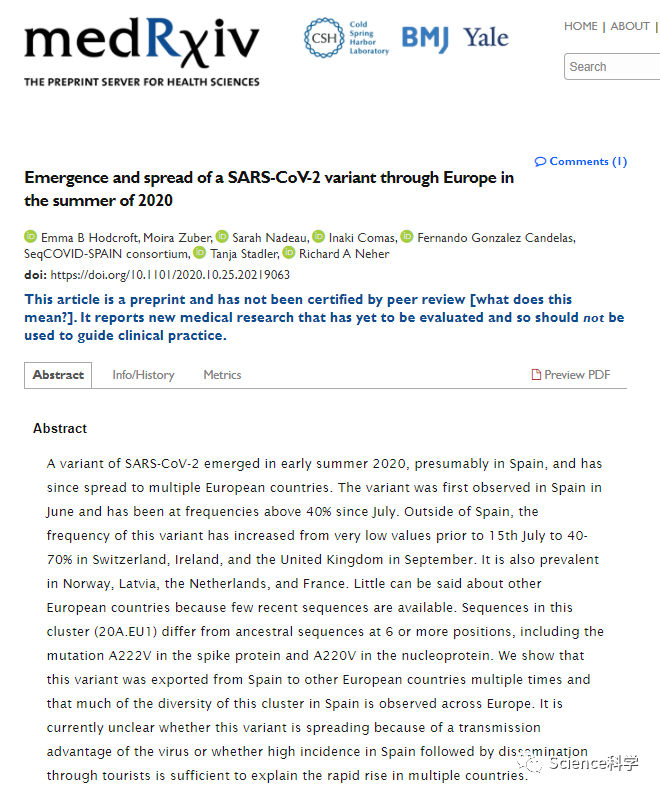 “西班牙的这个集群的大部分多样性在整个欧洲都能观察到,”研究人员写道。“目前还不清楚这种变种是否因为病毒的传播优势而传播,或者西班牙的高发病率随后通过游客传播是否足以解释在多个国家的快速上升。”